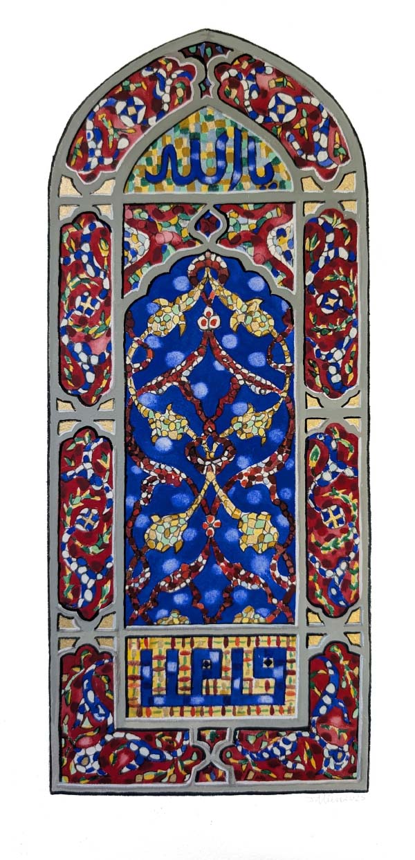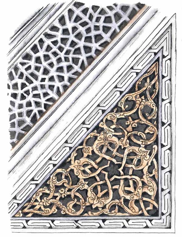 “For example, through producing a watercolor painting of a stained-glass window from the Suleymaniye Mosque, I feel that I truly understand how the window was constructed––windows in mosques were made of two layers, inside and outside––the complex interior pattern was outlined by stucco, and a different pattern of circles appears on the outside. Likewise, some of the geometry might at first glance seem effortless, but when you try to reproduce it, you realize just how sophisticated it is. For example, I drew a minbar carving that had a five-pointed design within a triangular framing that was extremely difficult to work out.”
