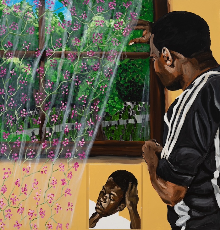 Jerrell Gibbs (b. 1988; Baltimore, MD) opposes deceptive perceptions of Black men by questioning master narratives and their connection to a muted visual history. Gibbs’ paintings are acts of resistance, asserting power over visual stereotypes. He paints the Black male figure with adornments, such as flowers, and contextualizes them in moments of peace, rest, and solitude. These gestures function to dismantle the visual misrepresentation of violence, trauma, and pain.