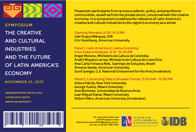 This project, initially a collaboration between the Inter-American Development Bank's Culture, Creativity, and Solidarity Affairs Division and Culture Center, and American University, seeks to illuminate the following question: What is the relevance of Latin America's creative and cultural industries to its overall economy? While the economic impact of the creative economy is increasing in Latin America, we still lack adequate metrics and indicators to understand the economic value of this sector, in particular, the diversity, productivity, consumption of, and growing investment in cultural goods and services. Nor do we understand how the creative sector relates to other important social and economic developments, including the urbanization of Latin American society and smart growth of cities, the emergence of new social media and the information economy, changing national identities, and multilateral frameworks incentivizing culture industries. Convening academics, practitioners and policy makers from both the U.S. and the region, an initial symposium, was held in November 2013, to address these questions and seek to articulate an agenda for next steps and best practices for researchers and decision-makers, going forward, with the goal of promoting Latin America's creative economy.