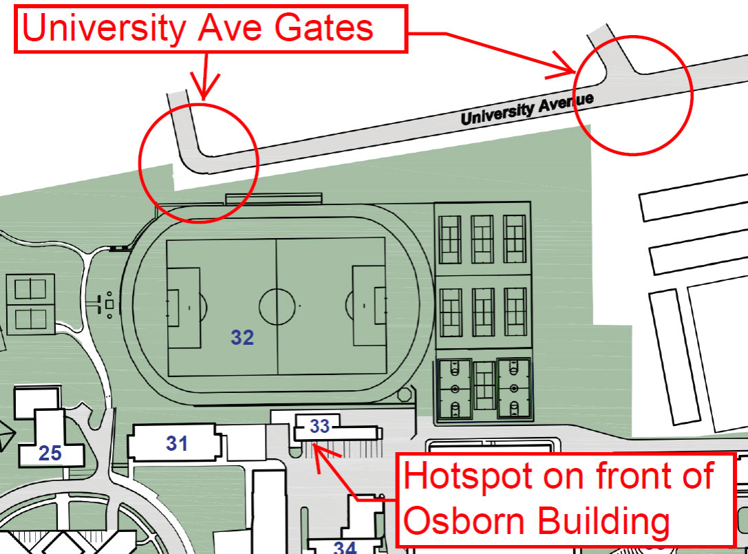 - The closest Hotspot reader is mounted outside of the entrance door furthest from the basketball courts in front of the Osborn Building. It can be accessed by walking from the track, past the basketball courts, and making a right-hand turn.